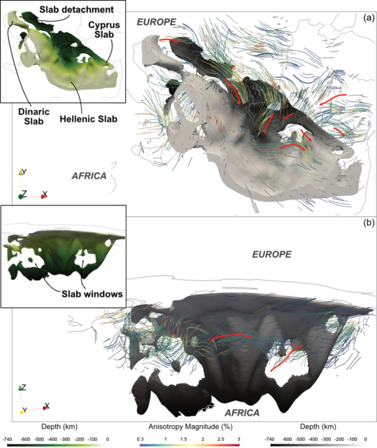 The Mediterranean is one of the most geologically complex regions on Earth. Colliding plates, subduction zones, volcanic activity, and mountain building have shaped it over millions of years. To understand what’s happening deep below the surface, we created the first 3-D model of the entire region that shows not only how fast seismic waves travel, but also the directions they prefer to move. This lets us “see” how mantle rocks flow and deform. Our model confirms large portions of sinking lithosphere, called slabs, and reveals where these slabs break, detach, or create “windows” in the mantle. These insights help reconstruct the Mediterranean’s geological history and show that the mantle is still actively moving today.